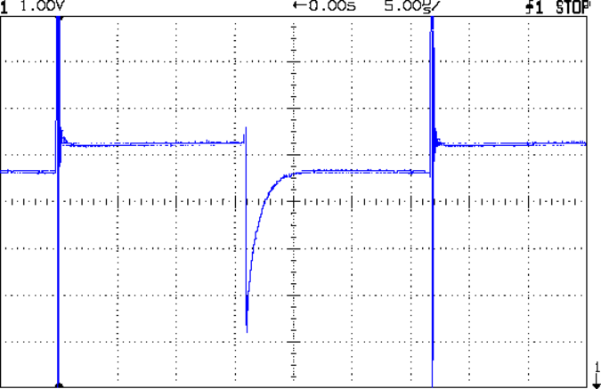 So that says the L/R time constant is (5.4 µH / 1.5 Ω) = 3.6 µs, which makes more sense: it’s entirely masked by the power supply transient.