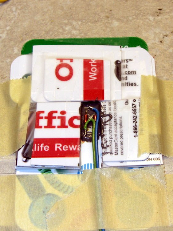 Having figured out the dual-thermistor circuit, I made a small mold from cut-up credit card-ish things, laid down a layer of JB Weld epoxy, and positioned the thermistor assembly just above it: