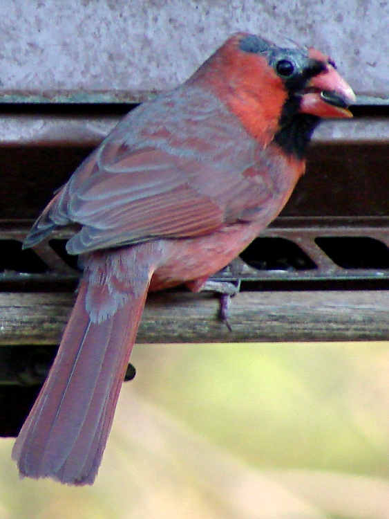 The balding Northern Cardinal continues to lose small head feathers: