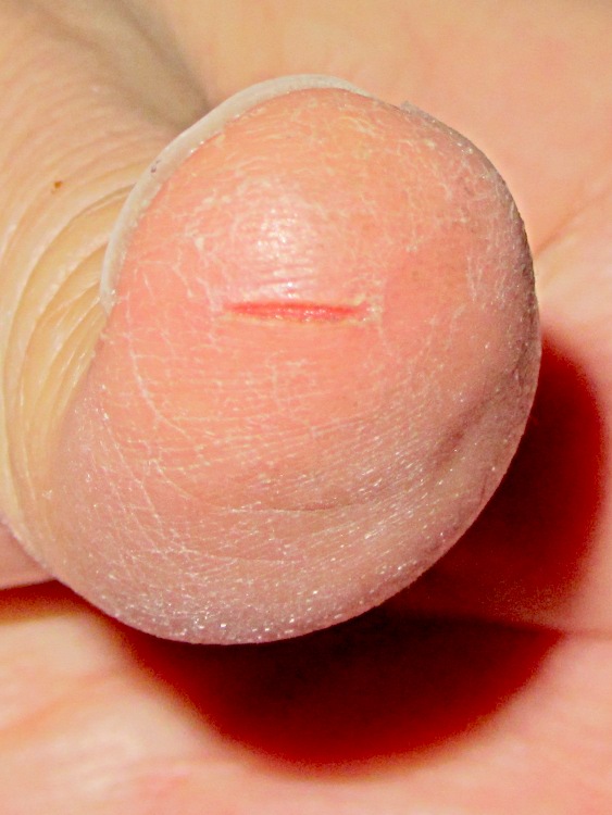 Of course, it didn’t stay bloodless for long: every time I put pressure on the ball of my thumb, the split gets longer.