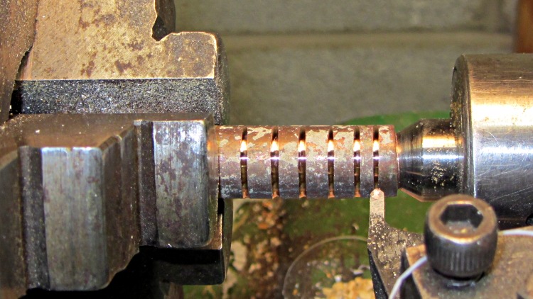 The hose ID is much smaller than ordinary “half inch” hose, so I turned some grooves on a chunk of copper tube that’s a snug fit inside: