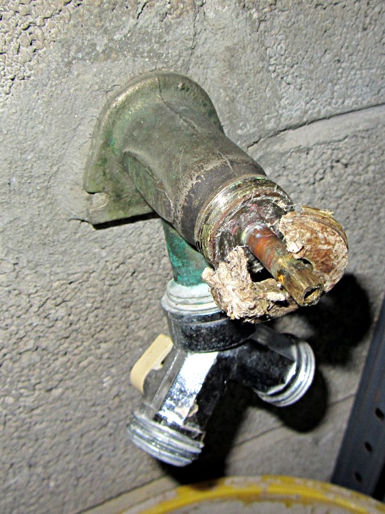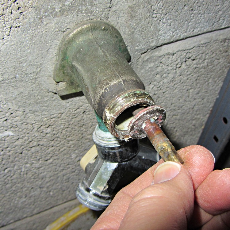 A frostproof valve tends to dribble after being shut off, because there’s a foot of nearly horizontal pipe that must drain completely, but this leak was in the gallon-per-hour territory. Obviously, the situation had gone from bad to worse, exactly as I’d expected.