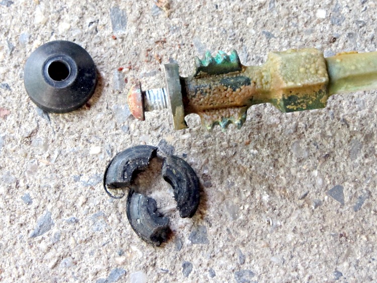 Unfortunately, unscrewing the stem eventually reached the point where it spun freely, but refused to pull out. That means the washer a foot inside the valve has swollen beyond the minor diameter of the threads near the seal and that means I must destroy the washer to extract it. The usual advice recommends pulling on the stem with pliers, but … suffice it to say that was not sufficient in this situation, not to mention that I didn’t want to goober up the stem.