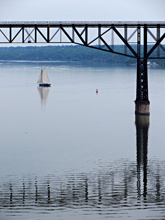 That’s the Sloop Clearwater as seen from the middle of the Poughkeepsie Bridge on an overcast day that brings out the vignetting in the long telephoto image.