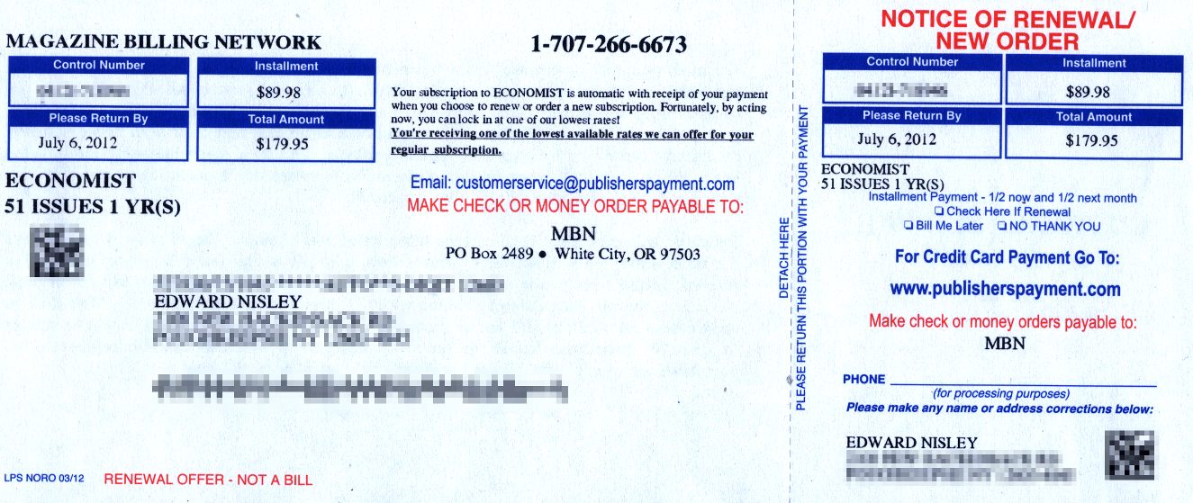 This just in: an offer to subscribe to The Economist at a mere $50 over sticker price…