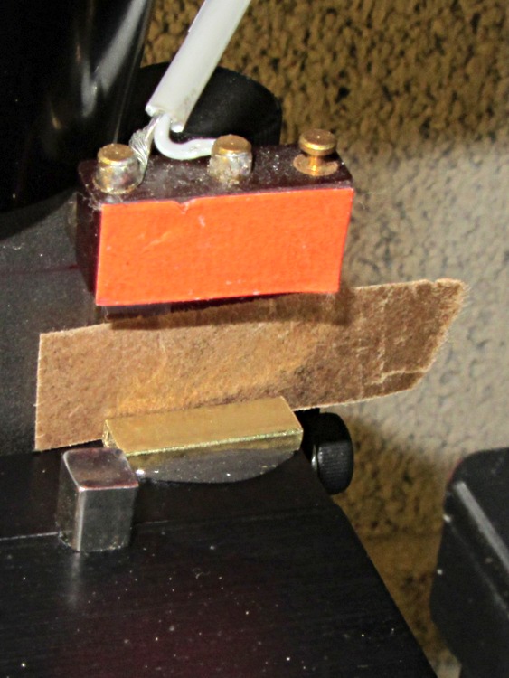 A snippet of rectangular brass tubing epoxied to the top of the Z axis saddle solves that problem by removing 3/32 inch of precious travel. A slip of brown waxed paper (yes, harvested from the new Y axis leadscrew wrapper) kept the epoxy off the dovetail.