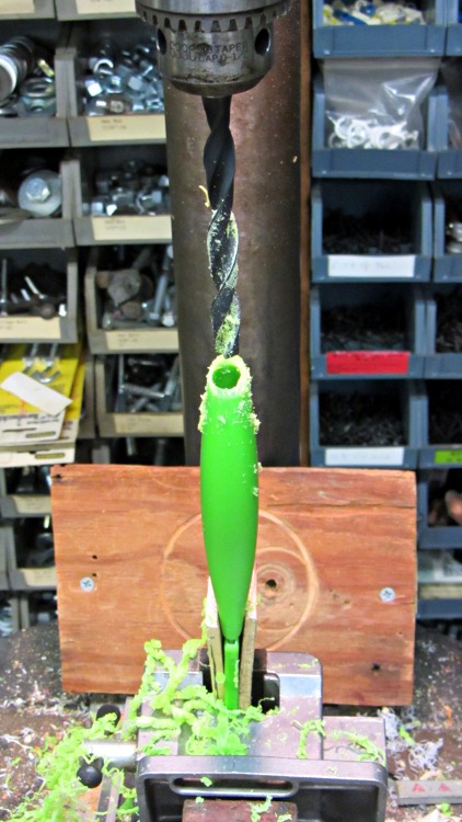 Waving a neodymium magnet over the handle convinced me that I could drill a hole slightly more than two inches deep without hitting the tang. I briefly considered drilling half a dozen smaller holes, but that started to look like a lot of work and I don’t have any suitable gun drills.