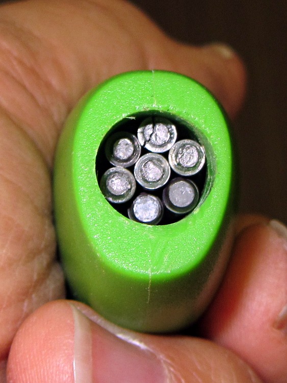 Seven electrodes weighed 32 g and, figuring the missing plastic rounds off to slightly over nothing, the handle now has 60 g of additional weight out toward the end, producing a knife weighing 185 g that balances near the narrowest part of the handle. It’s somewhat heavier than I’d like, but I can cope.