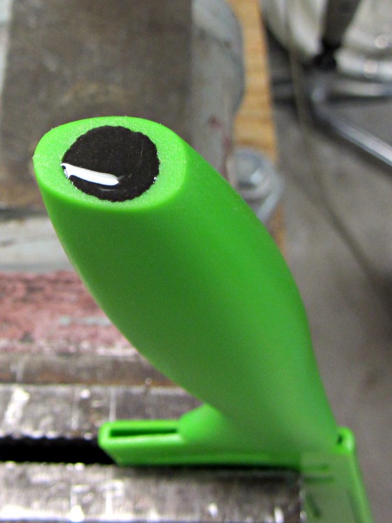 A dollop of epoxy atop the electrodes should seal them in place forever. I clamped the knife (in its color-matched scabbard) with the angled end of the handle water-level, so the epoxy settled in a neat, symmetric blob that looks better in person than it does here: