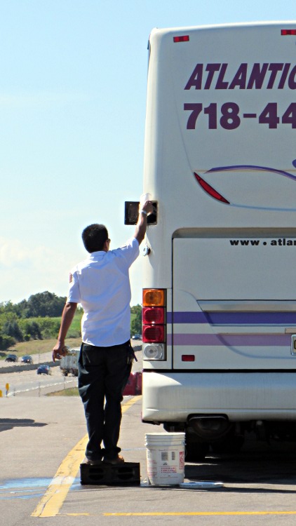 I think he’s refilling the toilet flush tank and, if so, I hope the bus designers made the drain tank much larger than the flush tank!