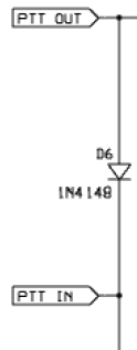 The TT3+ pulls its PTT OUT pin down from +5 V using a 2N2222A NPN transistor (off to the right in the schematic snippet), but, for reasons having to do with ESD, the input from the PTT switch on the handlebars goes through a 100 Ω series resistor, then passes to the TT3 board through PTT IN to D6 before joining the TT3 transistor collector. The low-active diode-ORed signal heads off through PTT OUT to a 10 Ω series resistor, thence to the KG-UV3D PTT input. D6 is an ordinary 1N4148, with the net result that the PTT input voltage at the radio dropped to 630 mV with the PTT button pressed.