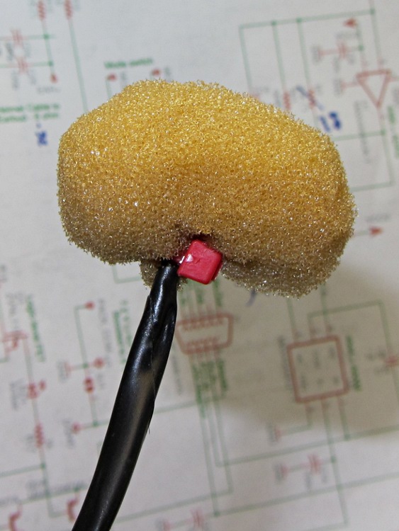 The foam comes from a sheet of Sonex acoustic foam baffle, snipped into a reasonable approximation of a ball, with a slit deep enough to surround the mic, and a cable tie holding it closed: