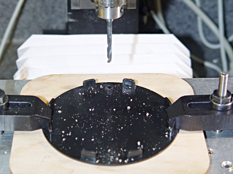 Despite its fancy appearance, the IBM clock consists mostly of brass and plastic, so I had no qualms about having my way with it in the shop. The new clock insert spanned the clock’s gilt plastic back cover, needing only a #1 drill hole for the adjustment stem, and exactly filled the available space between the back cover and the case. Both movements had enough interior clearance for 3-48 brass screw heads and nuts, so I eyeballed the right spots on the new cover, centered the Sherline spindle on the plate, and drilled two clearance holes 6 mm in from the edges on the vertical diameter: