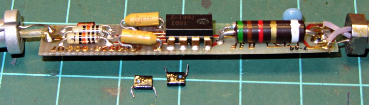 The two tiny black rectangular capacitors just to the left of the 8 pin DIP IC are C1 and C2, rated 10 μF at 2 V (yes, 2 volts). As you might expect, they had ESRs in the 3 to 5 Ω range, rather than around 0.2 Ω. The catch is that the case doesn’t have room for anything much taller, but I did contort some solid tantalum through-hole caps into the space available:
