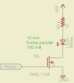 That’s a 10 mm warm-white LED with 5 parallel chips, running at about 100 mA from a 5 V supply, and driven from the same PWM channel and MOSFET that used to drive also drives the red channel of the RGB LED Mood Light:
