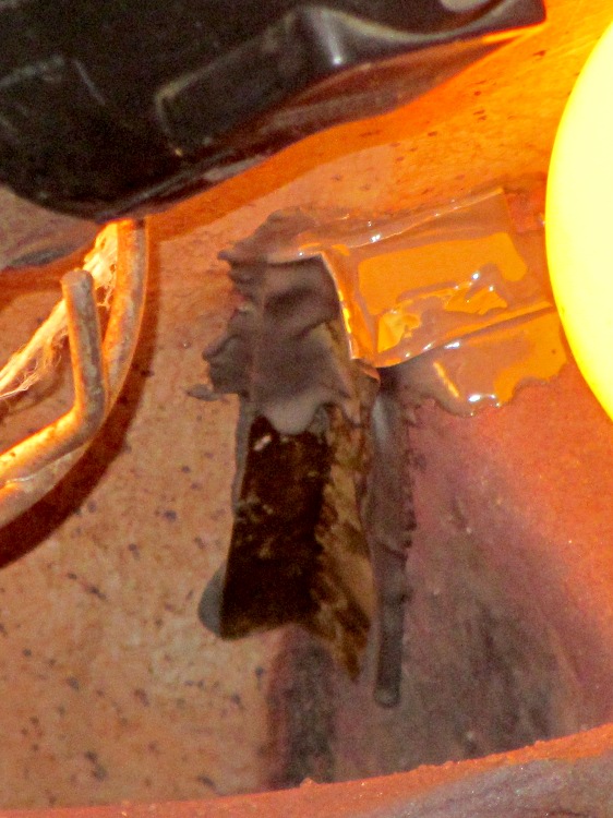 Now, this calls for a new furnace (because replacing the heat exchanger costs as much as a new furnace), but as it turns out this was in an unoccupied house during the week before Christmas. So I scrubbed off the debris with a steel brush, bent up a snippet of 2 mil brass shimstock to fit the corner, applied a layer of JB Industro-Weld epoxy to the problem, and positioned 200 W of incandescent bulbs to help it cure slightly sooner than forever: