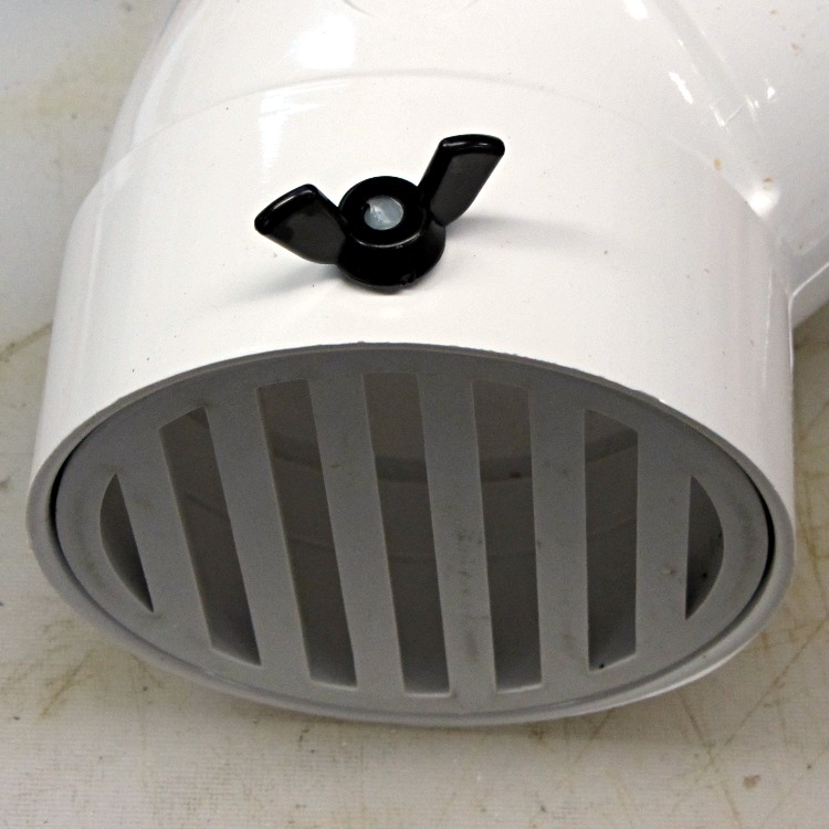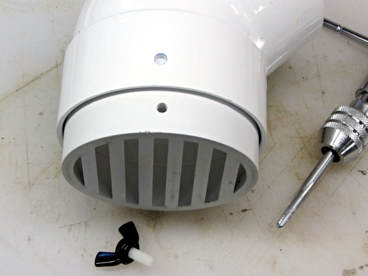 In principle, one would simply glue a grate into the final fitting and be done with it, but leaves from the gutter will pack behind the grate, so it must be removable. Leaving the grate loose means it’ll pop out at the slightest provocation and, most likely, roll another hundred feet down the driveway into the street.