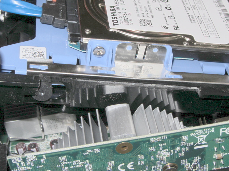 You must install the video card and then snap the drive carrier into place. The heatsink protrudes above the flange, with the left side just barely clearing that grommet.