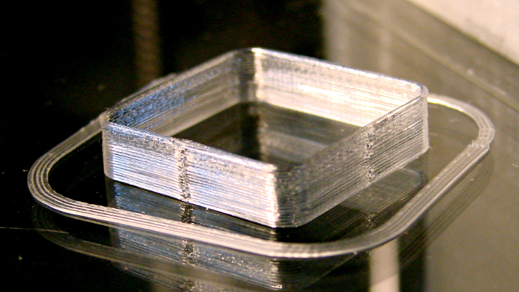 I took that picture after cracking them off the glass plate, then putting them back: the box really does line up with the skirt while printing. There’s another object visible in the background; that little box really was the first completely successful object.