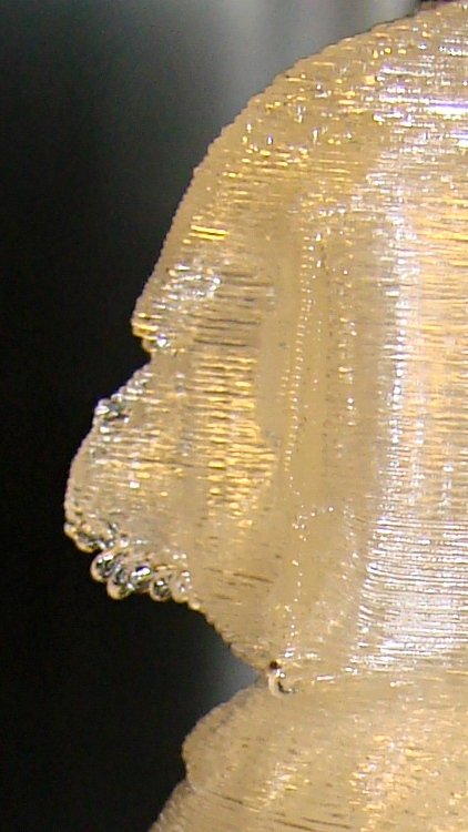 A closeup of the beak shows the crystal-clear drooping filament; a similar effect happened on the downward-pointing feather tips. Generally, this is a sign of too-hot extrusion, but at 165 °C I’m not convinced that’s applicable. It may simply be too much overhang at this scale:
