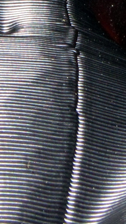A detail of the left hip shows that slic3r distributes the reversal zits, rather than lining them up in neat columns, and the M2 does a much better job of not depositing blobs at reversals: