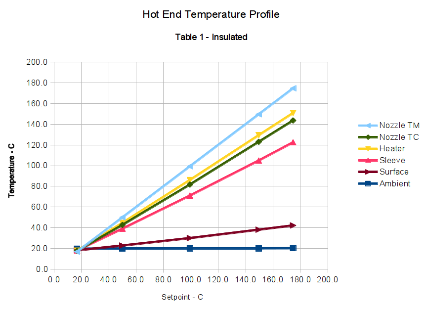 Conversely, Graph 2 shows the insulated Heater running hotter than the Nozzle TM. That also makes sense: with less heat loss through the Sleeve, the exterior of the heater gets hotter than the threaded brass cylinder in the middle, which is losing heat at both ends.