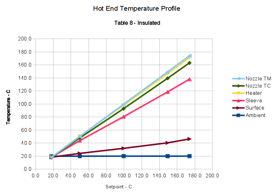 The data in Graph 4 clearly show that the correction factor I used to create Table 8 doesn’t apply with a different insulation wrap around the hot end. Although the Nozzle TM and Nozzle TC lines are quite close, they aren’t the exact match I saw before.