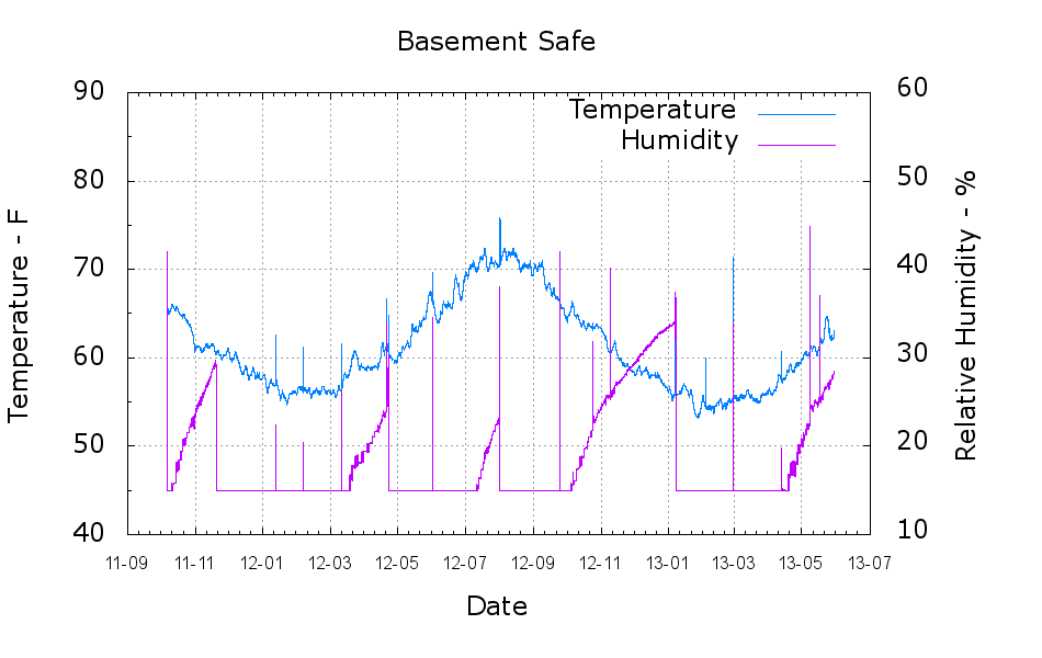 A plot of the temperature and humidity inside the basement safe over the last year-and-a-half: