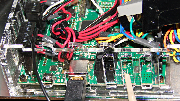 Based on the discussion attached to the post on Z axis numbers, I wanted to take a look at the points where Marlin switches from one step per interrupt to two, then to four, just to see what the timing looks like. The RAMBo board has neatly labeled test points, to which I tack-soldered a pin for the scope probe poked through one of the ventilation slots, and an unused power connector on the left edge of the PCB that provided a ground point (admittedly, much too far away for good RF grounding, but it suffices for CMOS logic signals). The Tek Hall-effect current probe leaning in from the top right captures the current in one of the X axis windings: