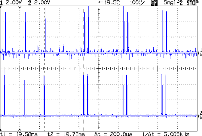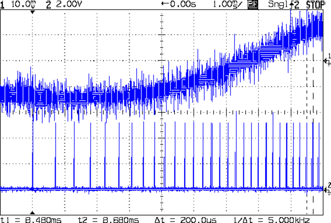 The interrupt frequency drops from just under 10 kHz to a bit under 5 kHz, with the doubled pulses about 16 μs apart. At the transition, the axis speed is 112.5 mm/s, pretty much as predicted.