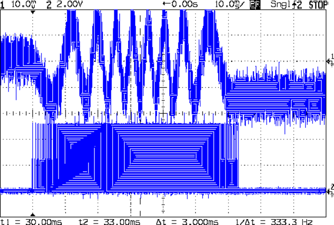 The lower trace is the X axis step signal produced by the Arduino microcontroller. You can barely make out the individual step signals at each end, but there’s not enough horizontal resolution to show them when the motor moves at a reasonable pace.