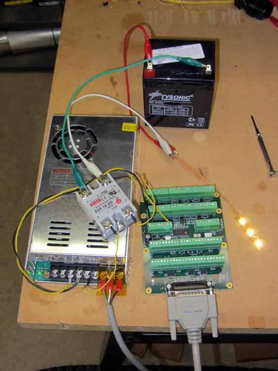 I intend to use solid-state relays to control things like extruder and platform heaters, so I wired a Fotek SSR-10 DD to the same output bit as the First Light test, with a random 12 V SLA battery providing power for the LED strip: