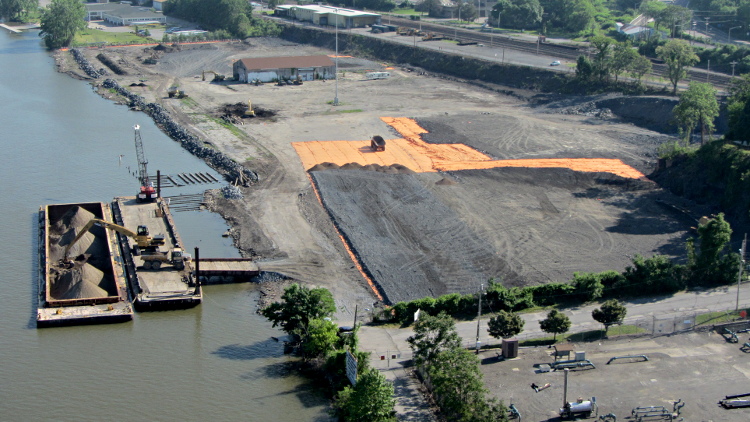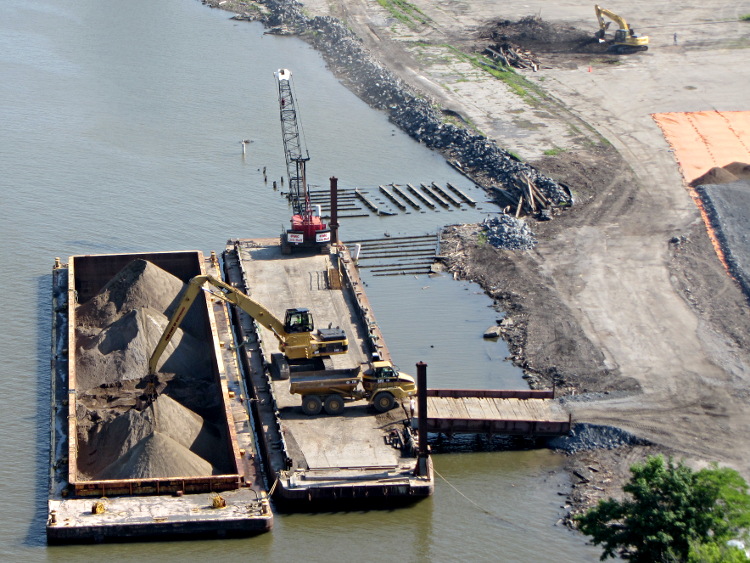 An excavator moves gravel from the barge, which probably came a few miles upriver (or downriver, depending on the aforementioned tidal flow) from the Tilcon quarry at Clinton (no relation) Point, into the dump trucks: