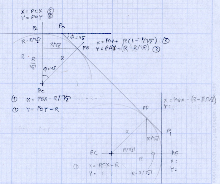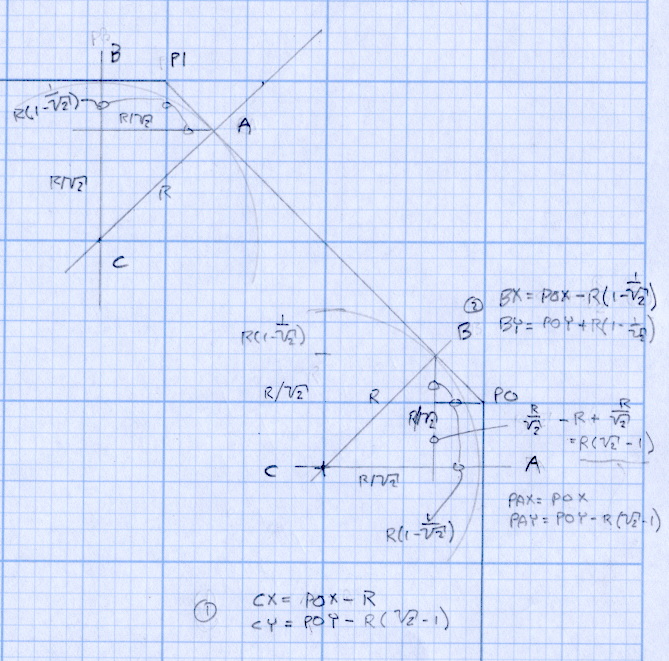 The radius on the three outside corners is a special-case solution of the general circle-through-three-points problem, taking advantage of the symmetry and right-triangle-ness of the corners. This sketch shows the details: