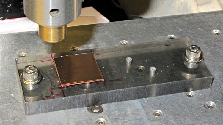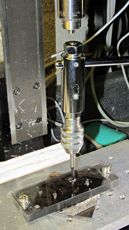 The left station will be for drilling the blanks clamped under a sacrificial sheet, so those screw holes aren’t used for anything other than clearance; the top millimeter will get chewed up pretty quickly. The screws in the right station will clamp a stack of drilled blanks under a cover plate. If I went into production, I could see using both stations for both functions, but …