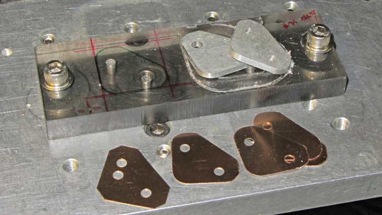 That worked quite well, although the top and bottom clips needed some slight attention from a riffler file and I did break the edges on all the clips. This shows four new clips along with a hand-cut prototype: