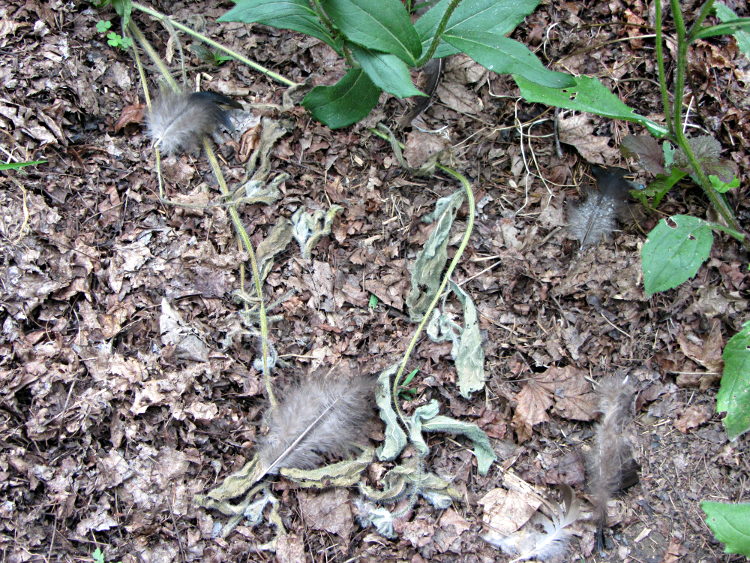 Mary found turkey feathers drifting across the garden, with the largest concentration near this assortment, much along the lines of the pile left at our back door. Given the 6 ft deer fence surrounding the garden and the complete absence of yummy debris, we think this wasn’t the work of a land-based predator.