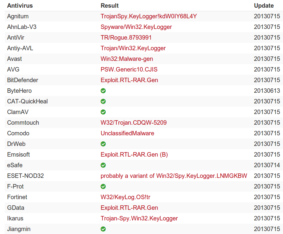 Anyhow, handing the entire RAR archive to VirusTotal produces the expected result: