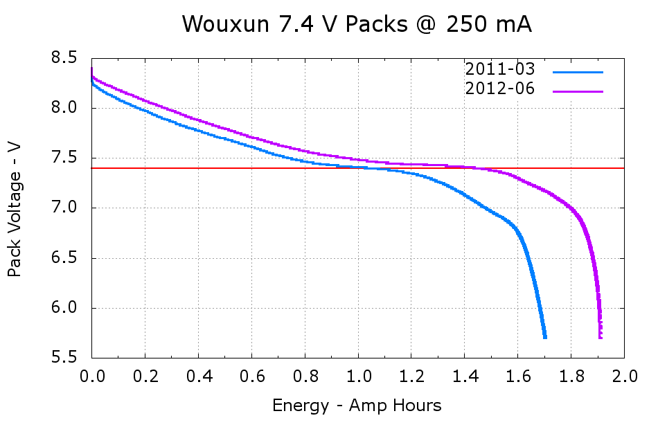 The 2011-03 battery has almost exactly the rated 1.7 A·h capacity, at least if you’re willing to run it down to 6 V, and the 2012-06 pack delivers 1.9 A·h. Electronic gadgets measure state-of-charge using the battery voltage, so the older pack “looks” like it has much less capacity: it runs about 100 mV lower than the newer pack out to 1.2 A·h, then falls off the cliff. Looks to me like one of the two cells inside is fading faster than the other; so it goes.