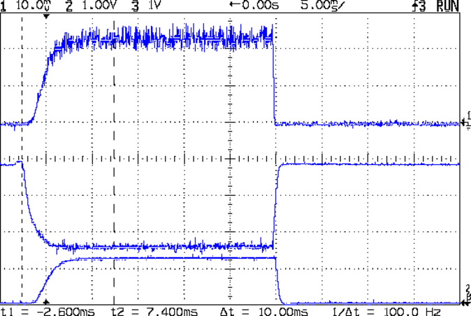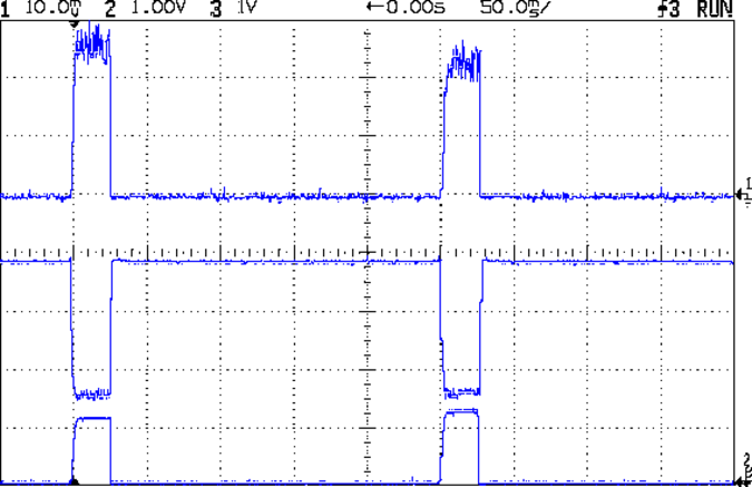 The middle trace is the MOSFET drain voltage at 1 V/div. The on-state voltage runs around 1.6 V, so the LEDs see about 5.9 V at 120 mA, about what you’d expect, with the little bit of PWM ripple accounting for the current sawtooth in the top trace. The off-state voltage is only 3.8 V, because the LEDs soak up the rest; it’s about 1.2 V per LED.
