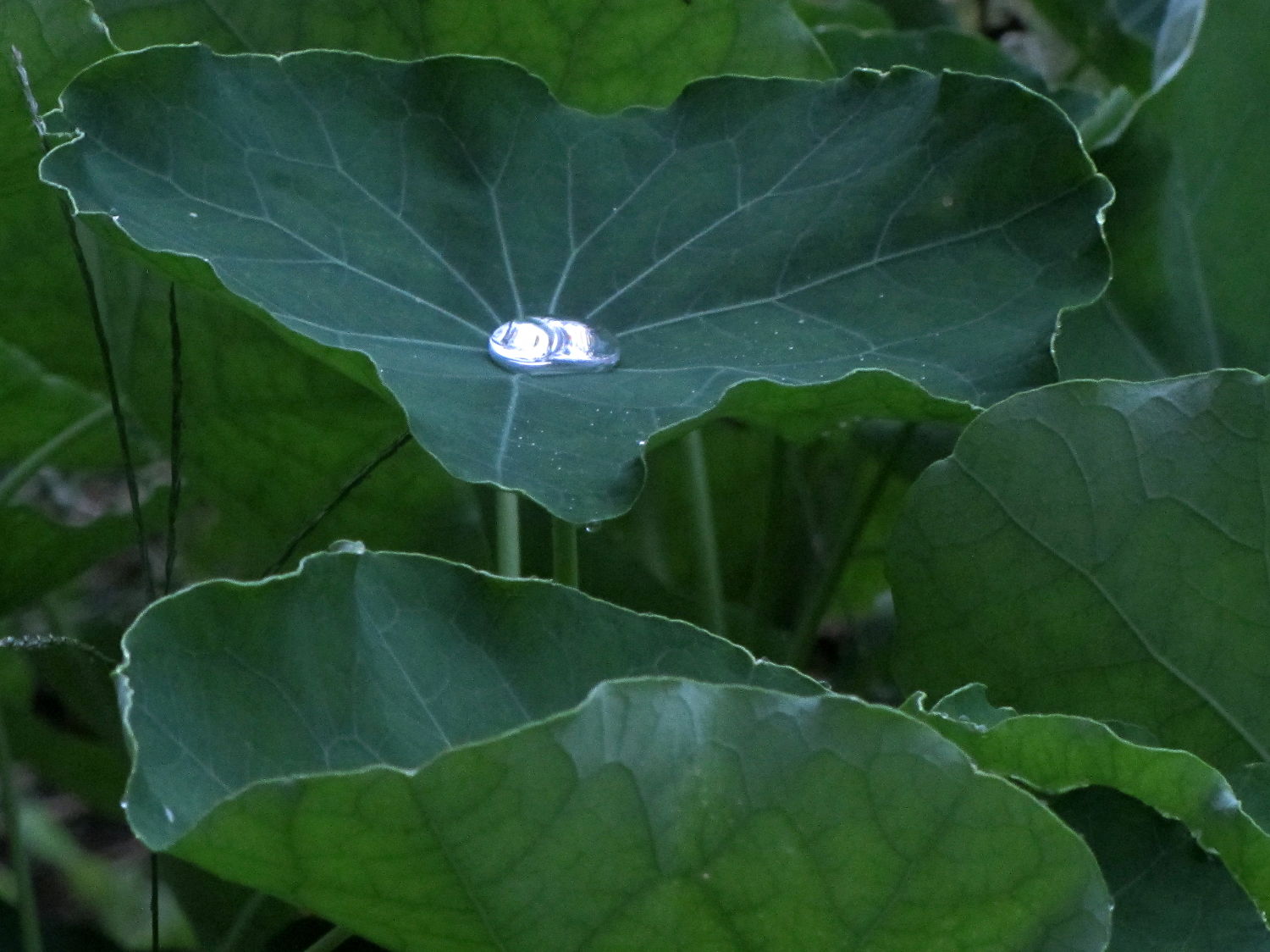 The water collected in nasturtium leaves after a shower looks like droplets of mercury: