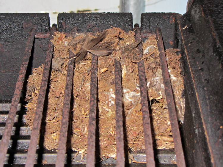 As nearly as I can tell, the mouse climbed up a square steel leg, scampered through the grease catch pan, leaped up through the drain hole, wriggled through three layers of crossed bars, and then deposited a single mouthful of building material.