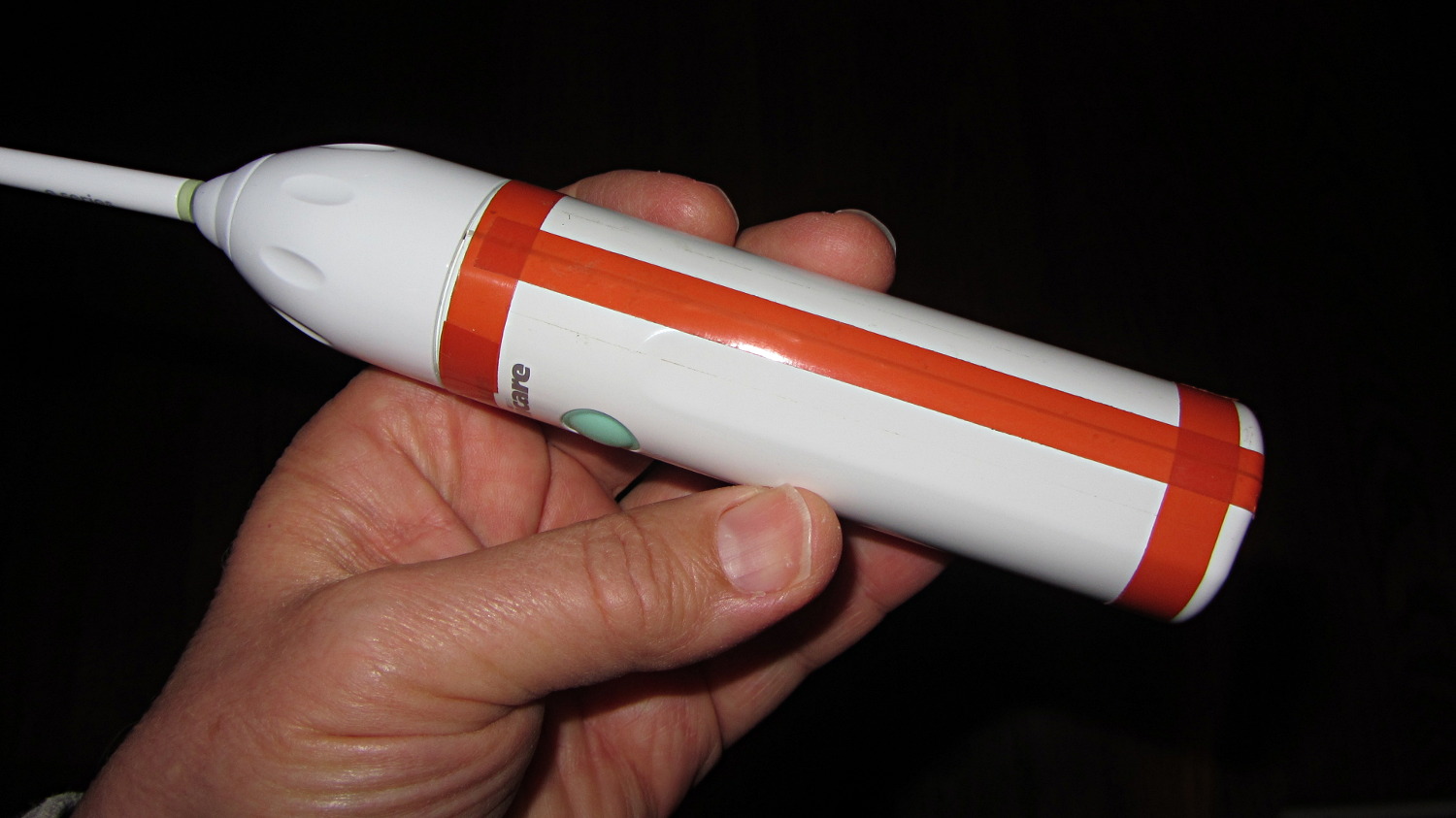 Much to my astonishment, the ordinary adhesive tape holding the Sonicare Essence power toothbrush together lasted for a bit over a year. As the tape splits along the gap in the case, the coil driving the brush head begins vibrating inside its nest, making a truly horrendous racket.