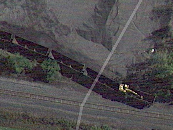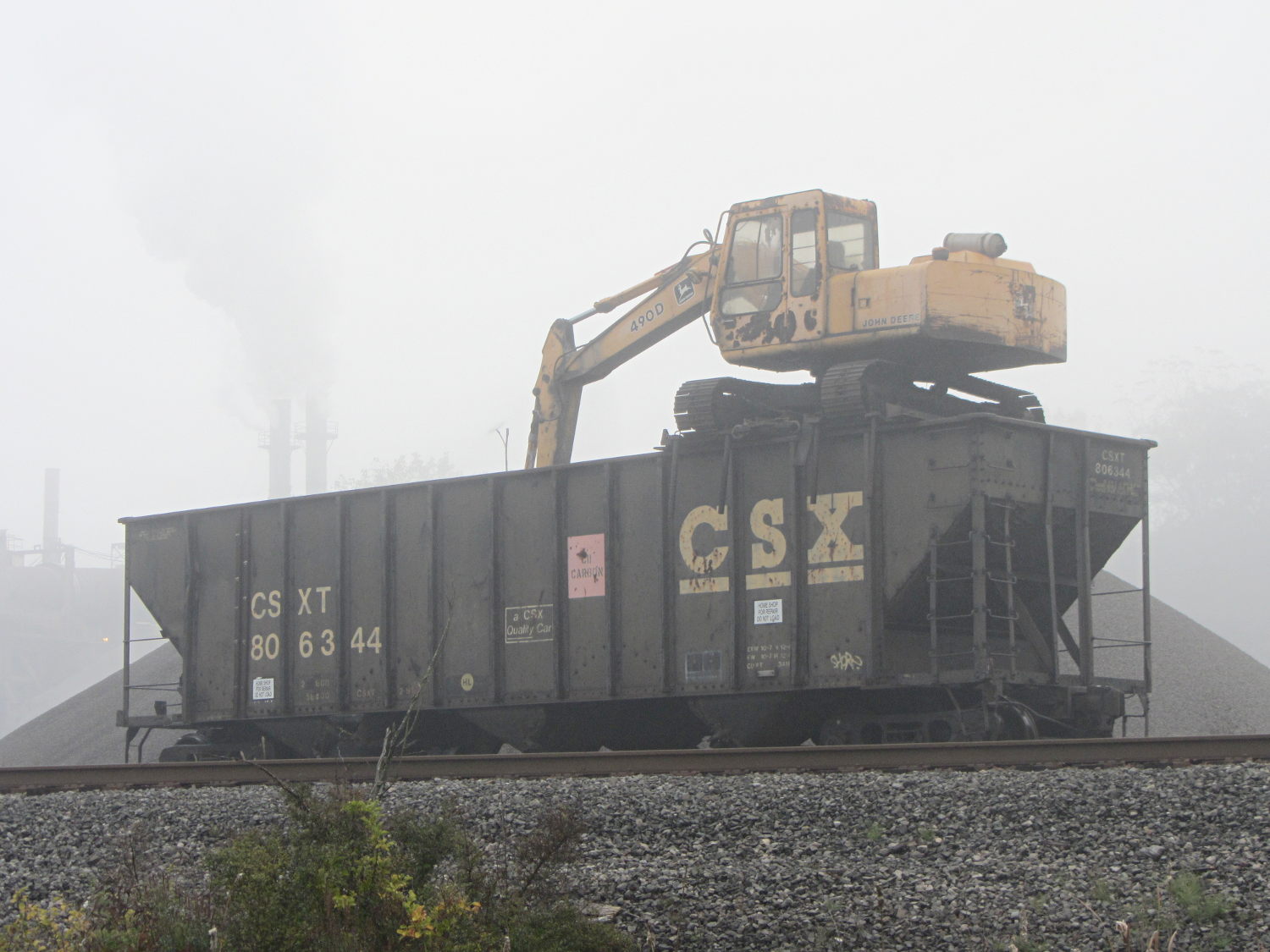 Some Google Maps fiddling reveals the plant, with the excavator atop the first car on the siding, down in the lower-left corner of the image: