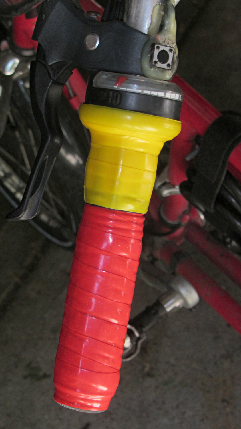 After more than a few years, the handlebar grips on my Tour Easy are rather worn, so I recently wrapped them with cheerful red and yellow silicone tape.