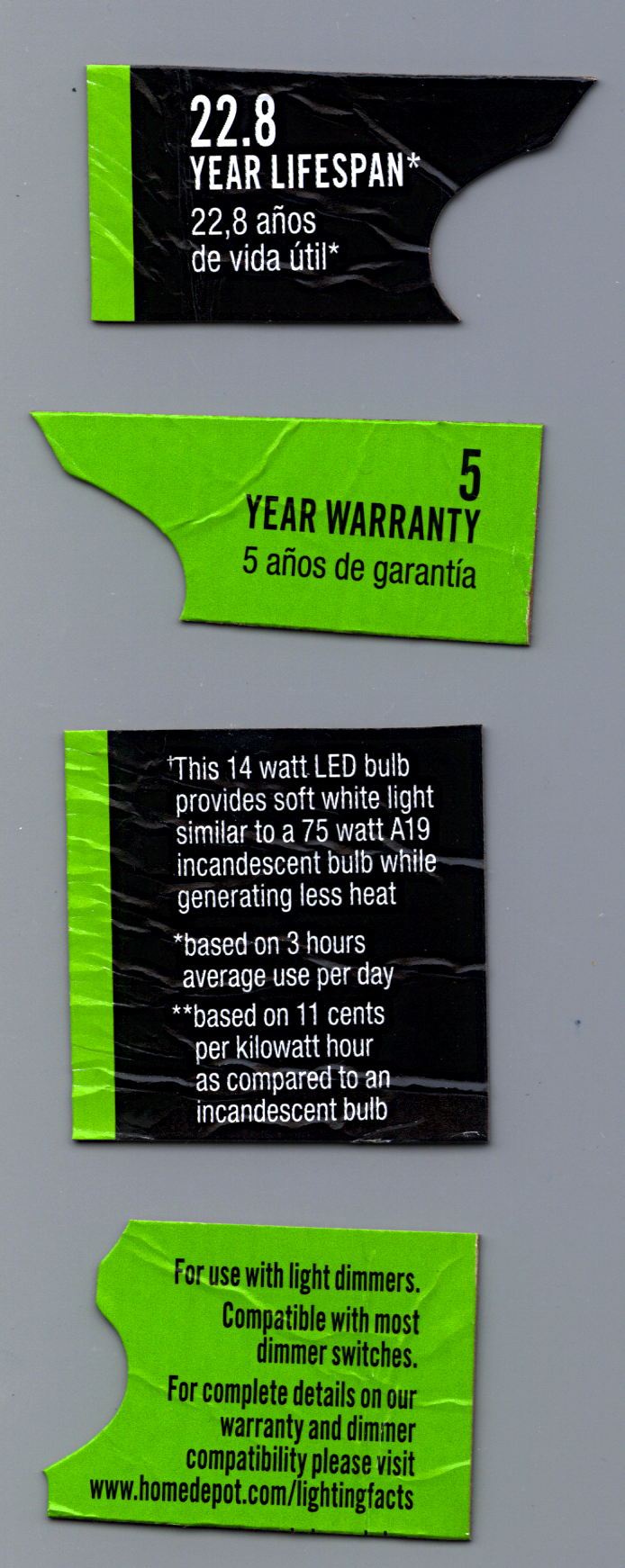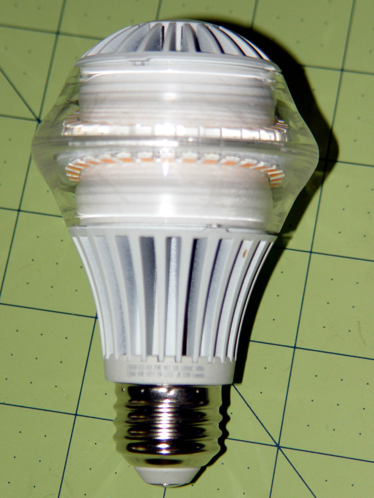 I picked up a $35 LED bulb that’s allegedly equivalent to a 75 W incandescent, replacing a 100 W equivalent compact fluorescent bulb that an X10 relay switch couldn’t turn off cleanly, for a torchiere floor lamp. ‘Nuff said about early CFL failures.