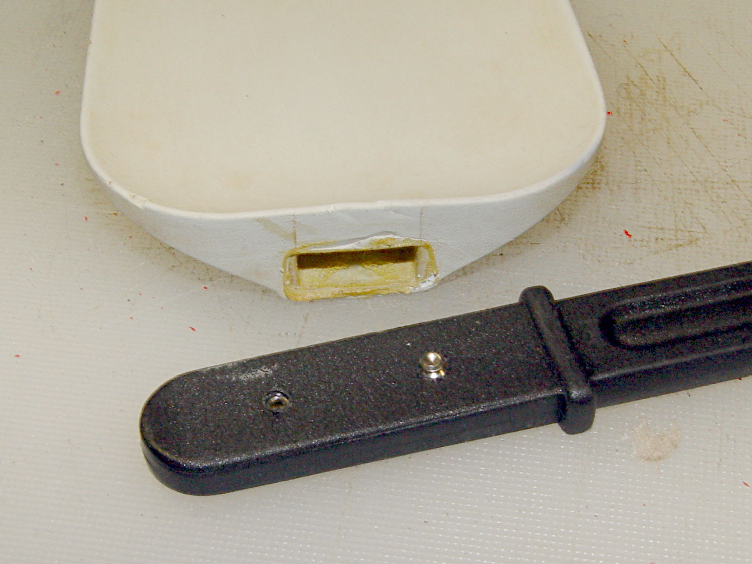Shortly after we bought this kitchen scraper spatula (or whatever it’s called), the handle pulled out of the blade and left it sitting in a bowl of batter. That turned out to be unsurprising, given that neither side of the interface has any mechanical locking features. I rinsed the batter off, stuck some urethane glue inside, rammed the handle in place, and hoped for the best. Lacking any mechanical interlock and not bonding to either surface, the adhesive didn’t improve the situation.