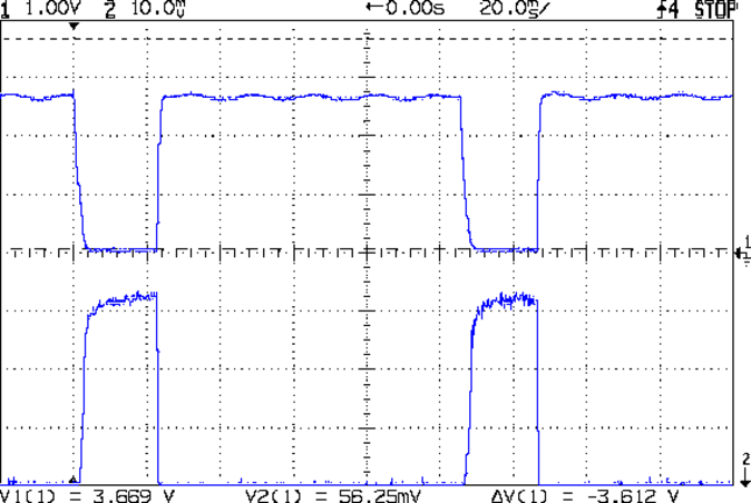 At 8.4 V from the bench supply, the MOSFET sees about 2 V. The top trace is the drain voltage, the bottom is LED current at 50 mA/div: