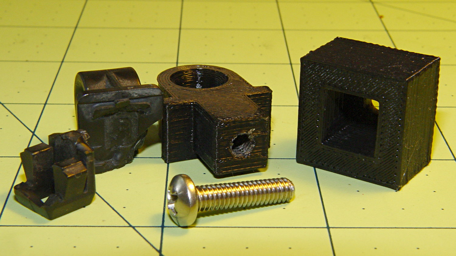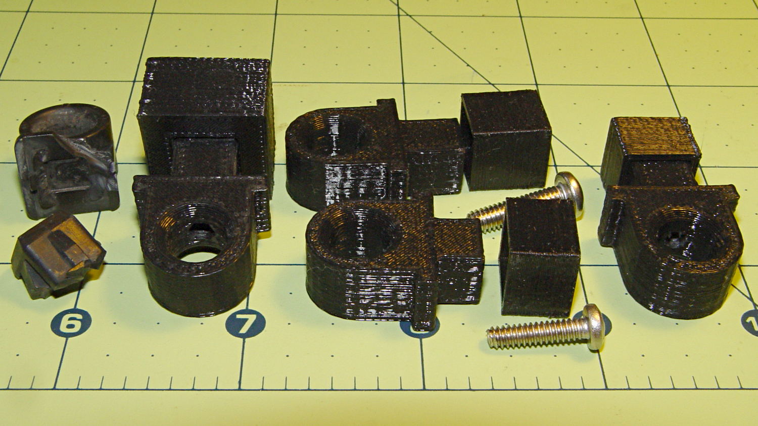 A group photo of all the versions, lined up from left to right, shows the broken OEM part, the first blocky attempt, the slimmed-down and too-long version to the rear, the shorter version that actually fit, and a backup part for when that one breaks: