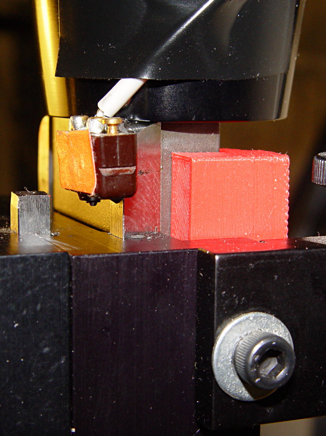 I ran the stage upward until it stalled, then epoxied a new switch (with the old fluorescent tape) in place. This shows the result after backing the stage down a few millimeters: